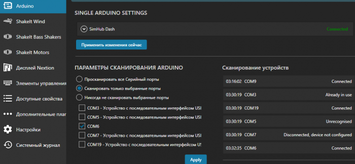 Уже всё собрал и думал вот сейчас-то наконец оттянусь по полной, но видимо что-то пошло не так, вентилятор сейчас не работает, не крутится. Хотя тогда еще, когда я его первично собрал для теста, тогда еще работал, крутился. Может-ли это быть от того, что когда я пересобирал его, провода от разъема питания к плате заменил на толстые, жесткие, одножильные, т.е. на такие, которые предназначены для проведения электрики в доме 220 вольт? Просто мне показалось, что так понадежнее будет чем на прежних тонюсеньких проводах, 20 ампер как-никак. В общем, заменил я провода на тонкие (взял от ненужного сгоревшего 12V адаптера), не помогло, вентилятор так же продолжал отказываться крутиться. Потом я попробовал вытащить с USB-хаба все остальные подключенные контроллеры, оставив только шнур от платы ветродуя, и вуаля, снова заработало! Значит дело было не в проводах, а в том, что когда я тестил его впервые, я всё остальное не подключал, поэтому он тогда еще работал, а теперь я установив ветродуй в кокпит уже всё вместе подключил, а так уже оказывается не работает. Получается, СимХаб уже нужно как-то по-другому хитро настраивать, когда подключены много джойстиков на Ардуино, а не так просто как на видео выше. Путем экспериментов пока что помогло переключение с "Просканировать все серийные порты" на "Сканировать только выбранные порты" и отметка галочкой только того порта, на котором плата ветродуя: