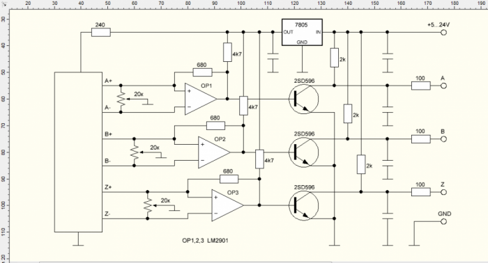 Схемы так и не нашёл, только общие по работе энкодера, в нете их на каждом сайте. Могу на пальцах объяснить. V4, V3, V2 это транзисторы, они открываются когда есть сигнал с микрухи и выдают напругу на выхода А В С, сопротивление выхода у меня с другой стороны 47 Ом. Микруха типа усилка, на неё приходит + и - с сенсора, а выход на транзисторы. не стой стороны начал))) вокруг микрухи всё подтяжки входов и выходов к питанию. А подстоечные резисторы на 20 кОм, для подтяжки выходов + и - с сенсора на землю. Ими подгонял длинну импульсов, это самое главное, они должны быть одной длины, что А, что В, это осцилографом. С даже не трогал. Таких маленьких не нашлось, подстроил тем что было, замерил каждое сопротивление и впаял набором резисторов, вышло примерно пополам, с небольшим перекосом. Как то так))) Найди даташит на микруху, единственное что у меня было и от чего отталкивался и смотри что приходит на входа, а дальше по цепочке У тебя есть подстроечные резисторы? Но фото их не видно. У меня они были залиты полностью пришлось менять. Увидел на другом фото