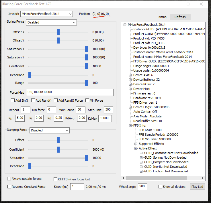 С настройками проигрался , когда максФорс ставлю больше, то через монитор могу запустить руль крутиться, но явно работает неправильно. Вместо пружины он просто начинает крутиться в одну сторону