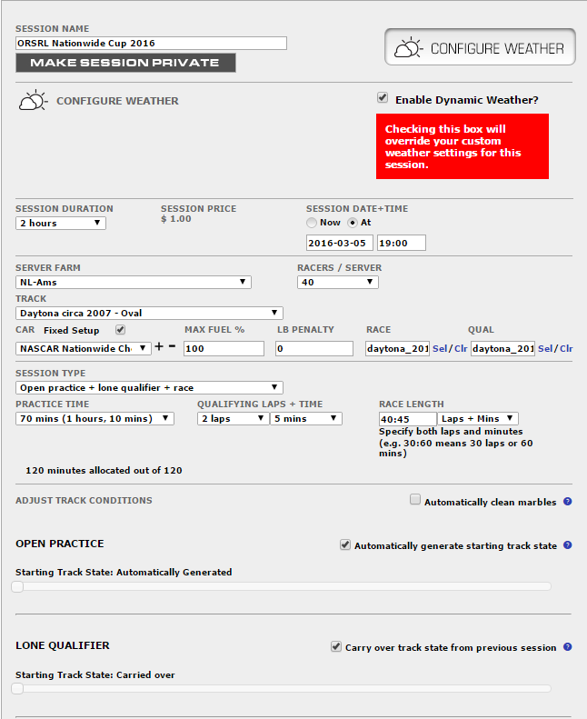 D.B.Cooper Опубликовано 3 марта, 2016 Автор Поделиться Опубликовано 3 марта, 2016 Выложи скрин с настройками сервака на тестовую сессию, я тогда в субботу и понедельник организую. Думаю так сделать, практика 70 мин, квала 5 мин, гонка 45 мин. 2 Ссылка на комментарий