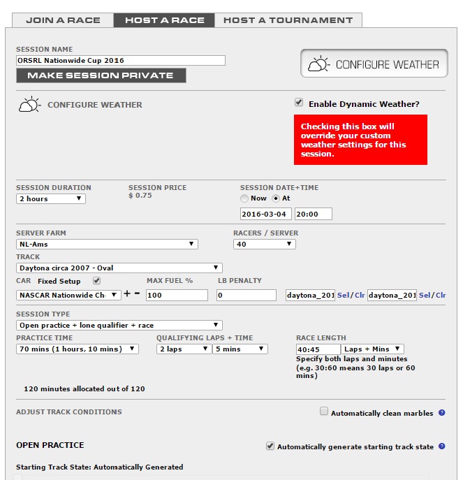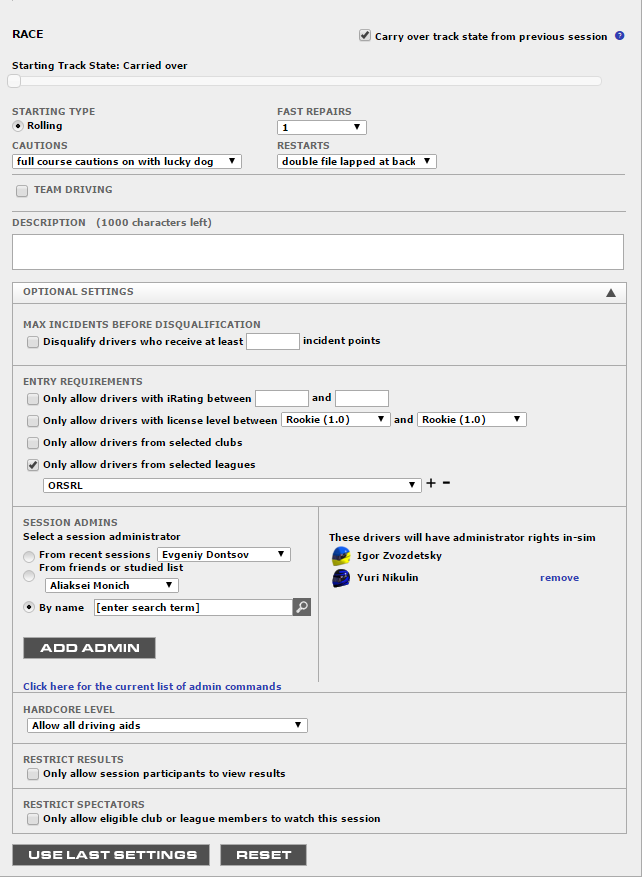 D.B.Cooper Опубликовано 25 февраля, 2016 Поделиться Опубликовано 25 февраля, 2016 (изменено) Расписание Дата: 10 марта 2016 (четверг) Время (+3UTC): Сессия: практика 19:00 - 21:00; квалификация 21:00 - 21:05; гонка 21:05 - 23:00 Регистрация на этап Регистрация: тут Предквалификационный круг должен быть записан: в одиночной сессии при стандартной погоде не иметь инцидентов вида offtrack, lost control, contact (2x-6x) Формат Трасса: Daytona circa 2007 - Oval Авто: NASCAR Nationwide Chevrolet Impala circa 2011 Сервер: ORSRL Nationwide Cup 2016 Пароль для сессии: см.стр. регистрации на этап Квалификация Погода: случайная, динамическая Состояние трека: генерируется автоматически, переходит из практики Тип: одиночная Продолжительность: 5 минут, 2 круга Сетап: фиксированный, daytona_2011_oval Заезд Длина: 60 кругов Погода: случайная, динамическая Состояние трека: генерируется автоматически, переходит из квалификации Быстрых починок: 1 Лимит инцидентов: 20 Стартовая решетка: по результатам квалификации Старт: с хода Рестарт: в 2 ряда, круговые сзади Пейс-кар: включен, "лаки дог" Сетап: фиксированный, daytona_2011_oval Особые требования: после финиша доехать своим ходом до боксов Из боксов стартуют - Практика #1 04.03 20:00 Практика #2 05.03 20:00 Практика #3 06.03 20:00 Практика #4 07.03 20:00 Официальный стрим этапа http://sc2tv.ru/channel/tescatlipoka Каналы онборд-стримов http://sc2tv.ru/channel/loggy http://sc2tv.ru/channel/jeferz http://sc2tv.ru/channel/arch-d-i-m http://sc2tv.ru/channel/unrealqw http://sc2tv.ru/channel/rfxdiesel http://sc2tv.ru/channel/druxxa Изменено 9 марта, 2016 пользователем D.B.Cooper 2 Ссылка на комментарий