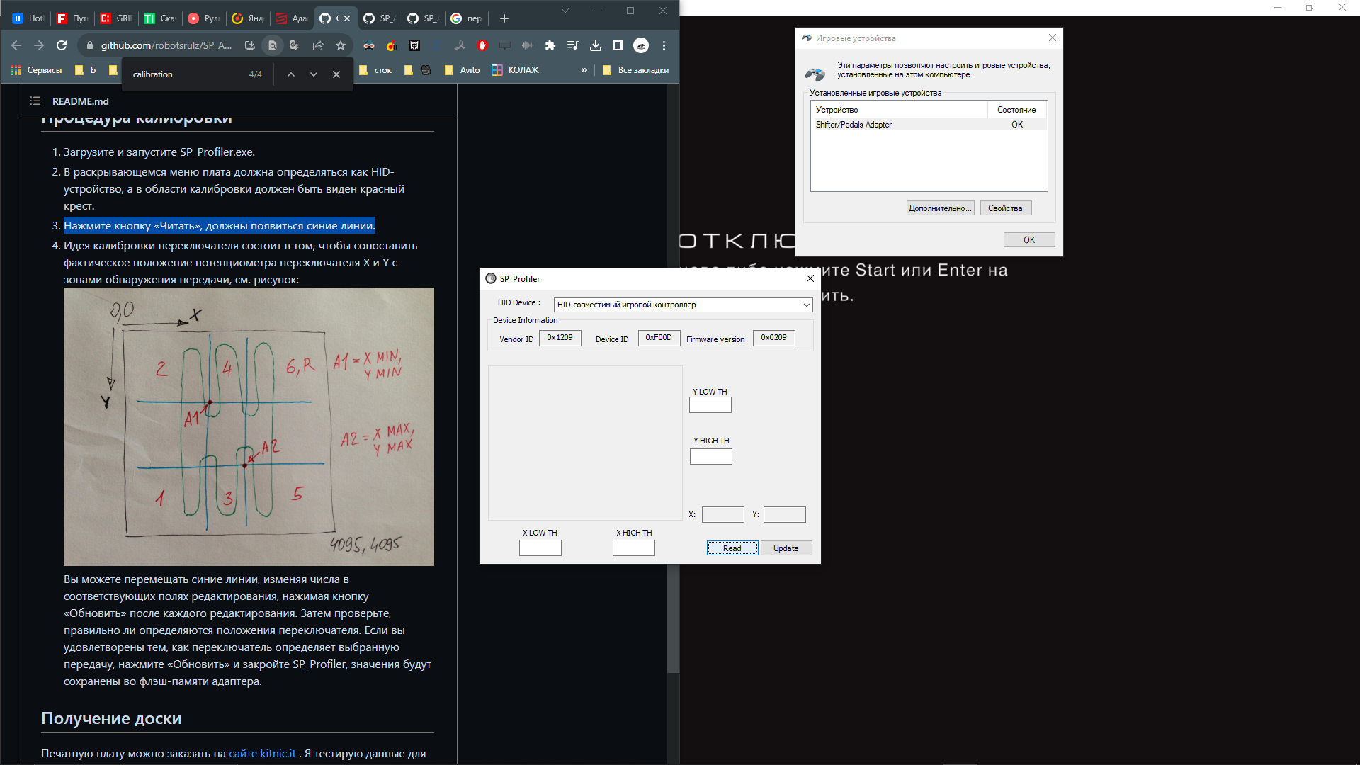 RomanST Опубликовано 20 сентября, 2023 Автор Поделиться Опубликовано 20 сентября, 2023 3 часа назад, teddylrg сказал: Здравствуйте, подскажите, пожалуйста, как прошить Ваш переходник? Подключаю кпп г25 и педали г25. он в компе отображается. сам горит преходник. но передачи не работают и педали тоже . как будто кнопки не назначены помогите пожалуйста Кто нибудь Помогите Пожалуйста как его Прошить автор переходника пожалуйста ответье мне как с вами связаться https://github.com/robotsrulz/SP_Adapter Firmware update Disconnect the device and open the case. Place jumper BOOT0 to right position (assuming you're holding the board with USB connector down and DB9 connectors left and right. Normal position of BOOT0 jumper is left side). Install STM DfuSe, download it here: https://goo.gl/JMUFBS (free registration required). Alternatively install it from my Google Drive: https://goo.gl/dp4XGH Connect the board to computer, it should be detected as "STM device in DFU mode" Download firmware .dfu file. Run DfuSe, mark Verify checkbox, press Choose button, select firmware image, then press Upgrade, agree to the warning message. When Progress bar turns blue firmware update is complete, disconnect the board, move jumper BOOT0 back to the left position, close the case, connect it to computer, the board should be detected as "Shifter/Pedals Adapter". Firmware update complete! Если адаптер отображается как джойстик в системе, то нужна не перепрошивка, а калибровка, там же по ссылке есть калибратор и описание процедуры. Ссылка на комментарий
