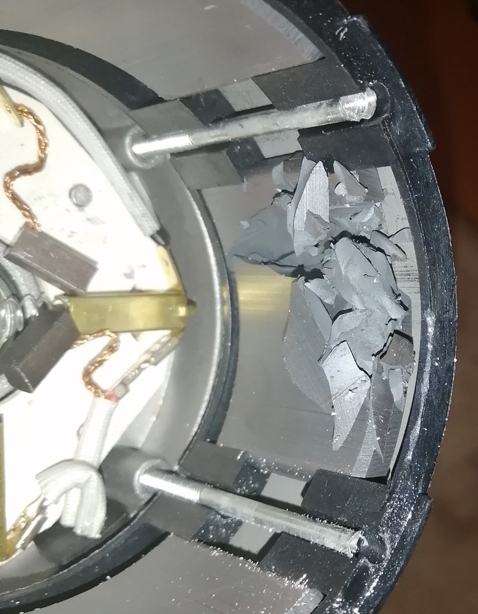 Народ, вроде бы все собрал, все работает, но получилась чисто случайно вот такая проблема: при переборке конструкции движок MY1025 упал с высоты полметра и пришла хана одному из магнитов статора (см. фото). Есть у кого-нибудь информация о том, какая маркировка у данных магнитов (на али нашел разные, но не нашел конкретно для этого)? Либо может у кого-то есть сдохший MY1025? Или магниты от него? Китаец у которого покупал - игнорит, паспорта на данный движок в интернете тоже не нашел. Пробовал склеивать это все "счастье", но после 3 часов склеивания - психанул) Может у кого будут дельные идеи как восстановить/заменить магнит)