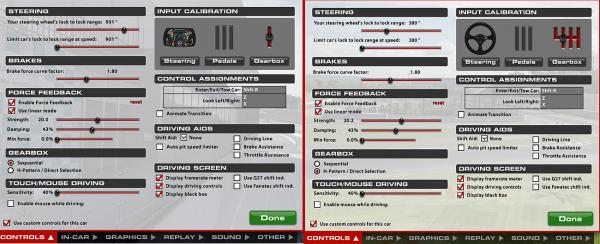 GranDoxin Опубликовано 2 ноября, 2012 Поделиться Опубликовано 2 ноября, 2012 Ты когда выставляешь меньшие углы в iR ты в драйверах угол меняешь? Нет - в драйверах всегда 900. В Ир я не меняю углы - он сам их меняет, как ему хочется :)) Убил сейчас профиль Ир. Захожу в сим, Лотус. Руль крутится снова нелинейно. Только на этот раз на меньшие уголы, чем реальный. Снова калибрую. Углы синхронизировались, а цифрв углов стала вместо 380 - 875 И еще — на скринах глобальные настройки фидбэка, а что в настройках к конкретному профилю? Там тоже самое. Но я уже по совету Даниила убил профиль Ир, теперь есть только глобальные настройки. Сейчас все перекалибрую. Ссылка на комментарий