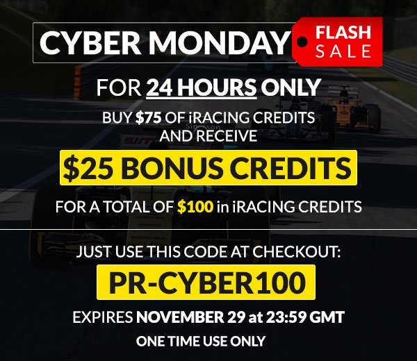Если кто не успел нарефералить себе iRacing Credits, то ровно сутки, до 3 ночи 30 ноября (по Московскому времени) действует промокод PR-CYBER100 — $100 за $75. 25% скидка не много, но в связи с отменой рефералок это лучшее предложение.