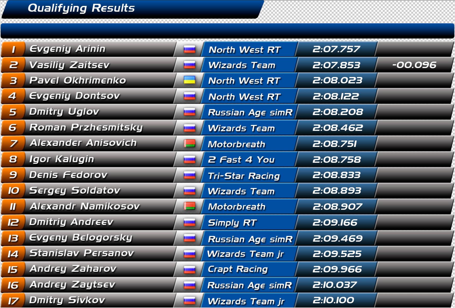 VeTeR Опубликовано 16 марта, 2013 Поделиться Опубликовано 16 марта, 2013 В общем такая у меня задумка, делаю графику для наложения на видео, пока почти закончил таблицу результатов квалы. Делаю в фотошопе, с векторной графикой не работаю. Пока все делается медленно, все данные вбиваются вручную. Общая таблица будет выглядеть так: Панельки с именами гонщиков так: Думаю когда все это будет готово, то дальше дела пойдут быстрее. Ссылка на комментарий